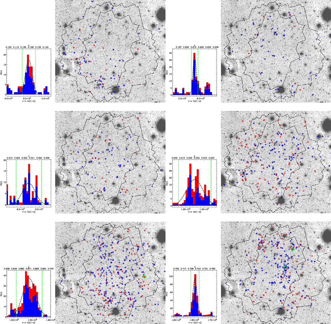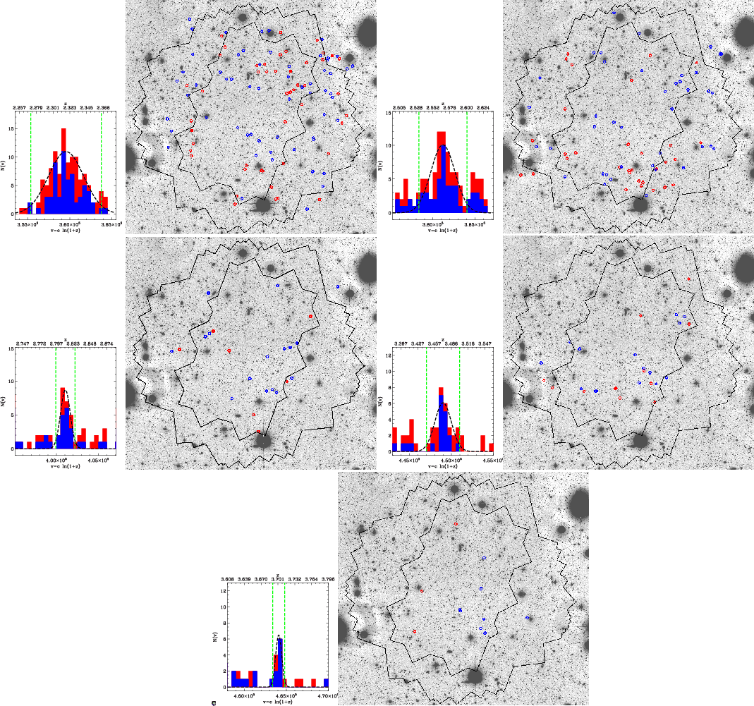 In Figs. C.1, C.2, and C.3 we show 12 VIMOS spectra of X-ray sources with new redshift determinations (i.e. either unknown before or improving previous estimates), obtained fromthe last 8 VIMOS masks released in this paper. Together with each spectrum we provide a finding chart with the position of the corresponding X-ray sources. These sources also appear in the new catalog of X-ray sources detected in the ECDFS, which includes the identification of optical and near-IR counterparts (Silverman et al., in preparation).![]() |