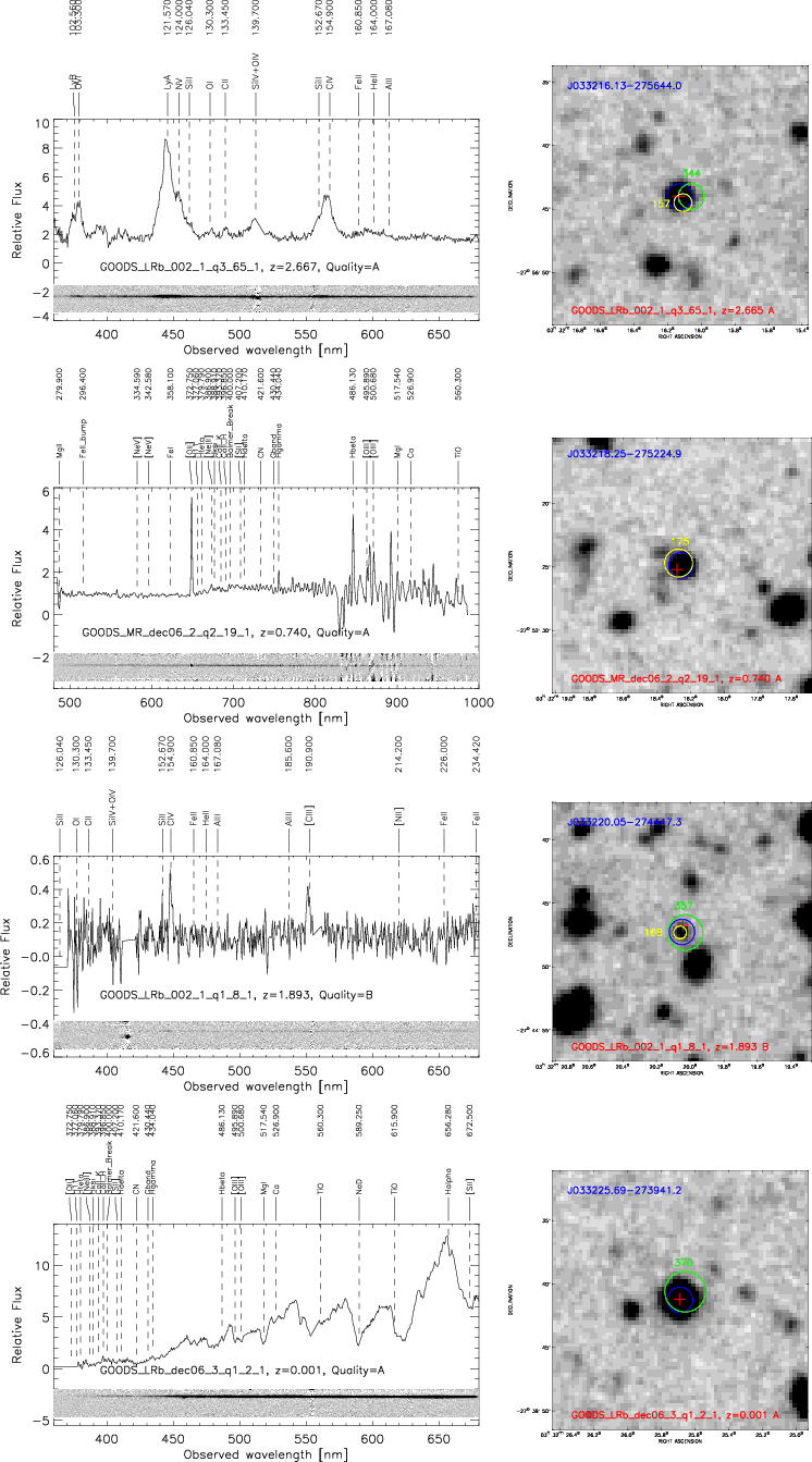 - GOODS_LRb_001_q4_44_1 and GOODS_LRb_003_new_ q4_28_1 at z=1.6285 (flag B) in the previous release. We reviewed the redshifts of the two spectra for this object, which were based on the identification of two very broad emission lines (i.e. CIV and CIII]). In addition, we identified several absorption lines (e.g. FeII, AlIII) that helped further calibrating the redshifts. The new measurements are z=1.609 (flag A) and z=1.608 (flag A) for GOODS_LRb_001_q4_44_1 and GOODS_LRb_003_new_q4_28_1, respectively;