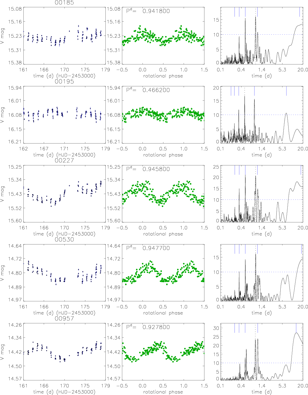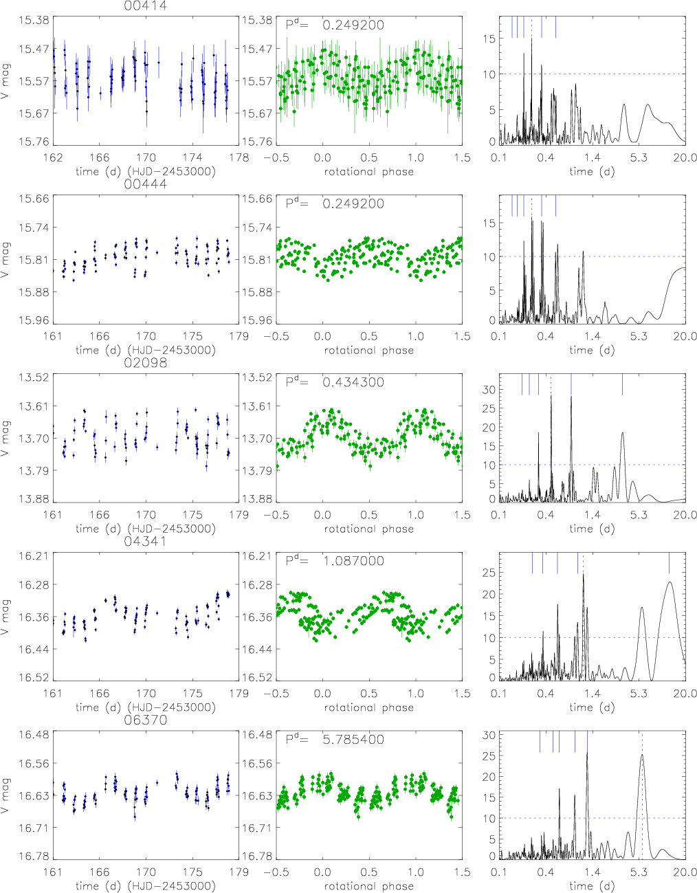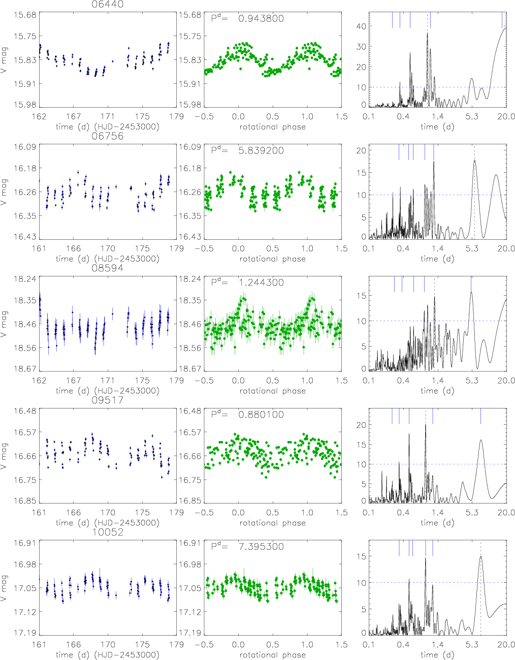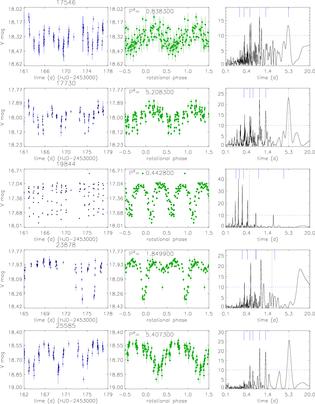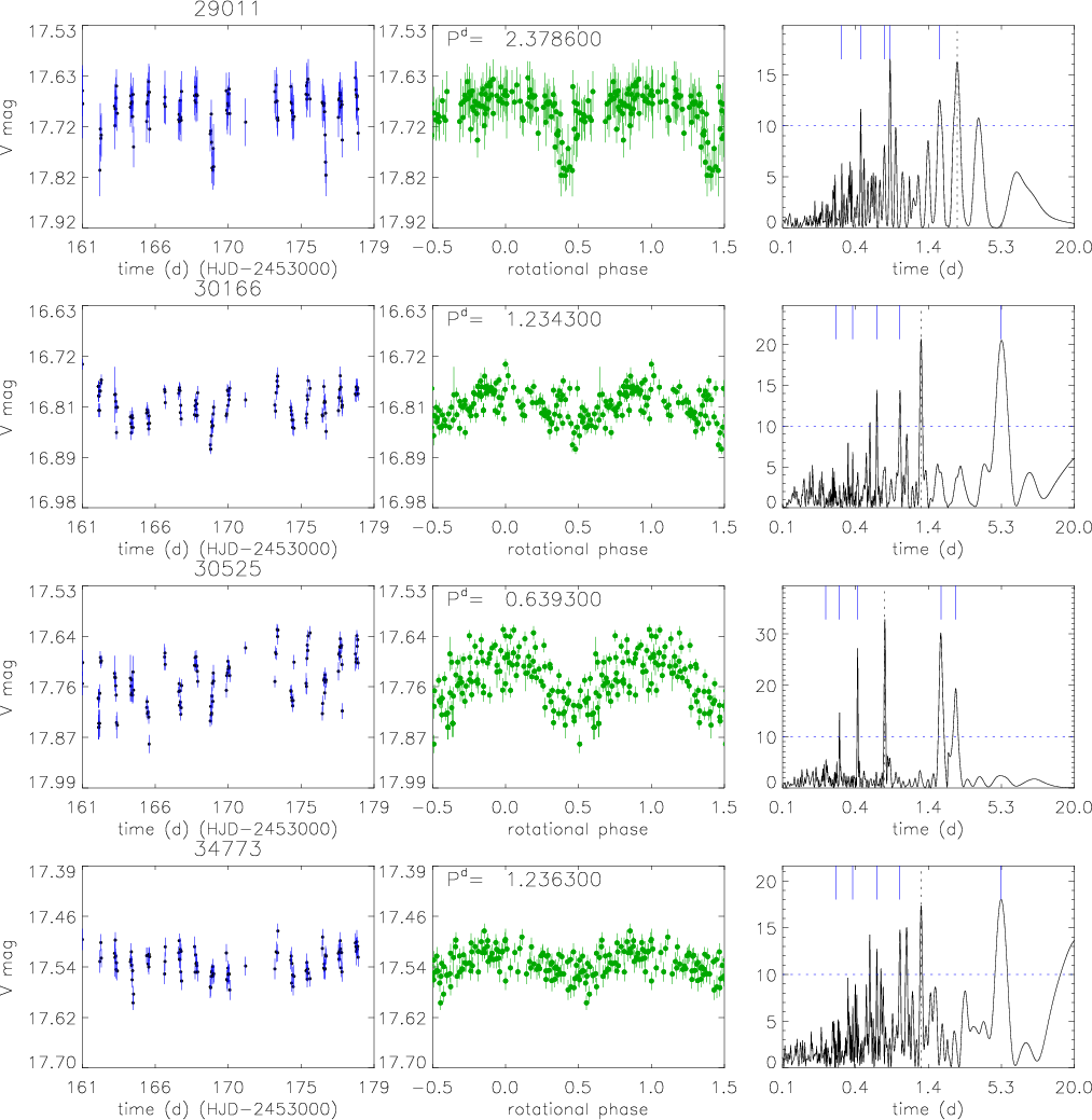 Figure 10: High-probability ``a'' periodic candidate cluster members. From left panel: V-band time series, phased light curve, and Scargle periodogram. See Sect. 4 for a detailed description. |