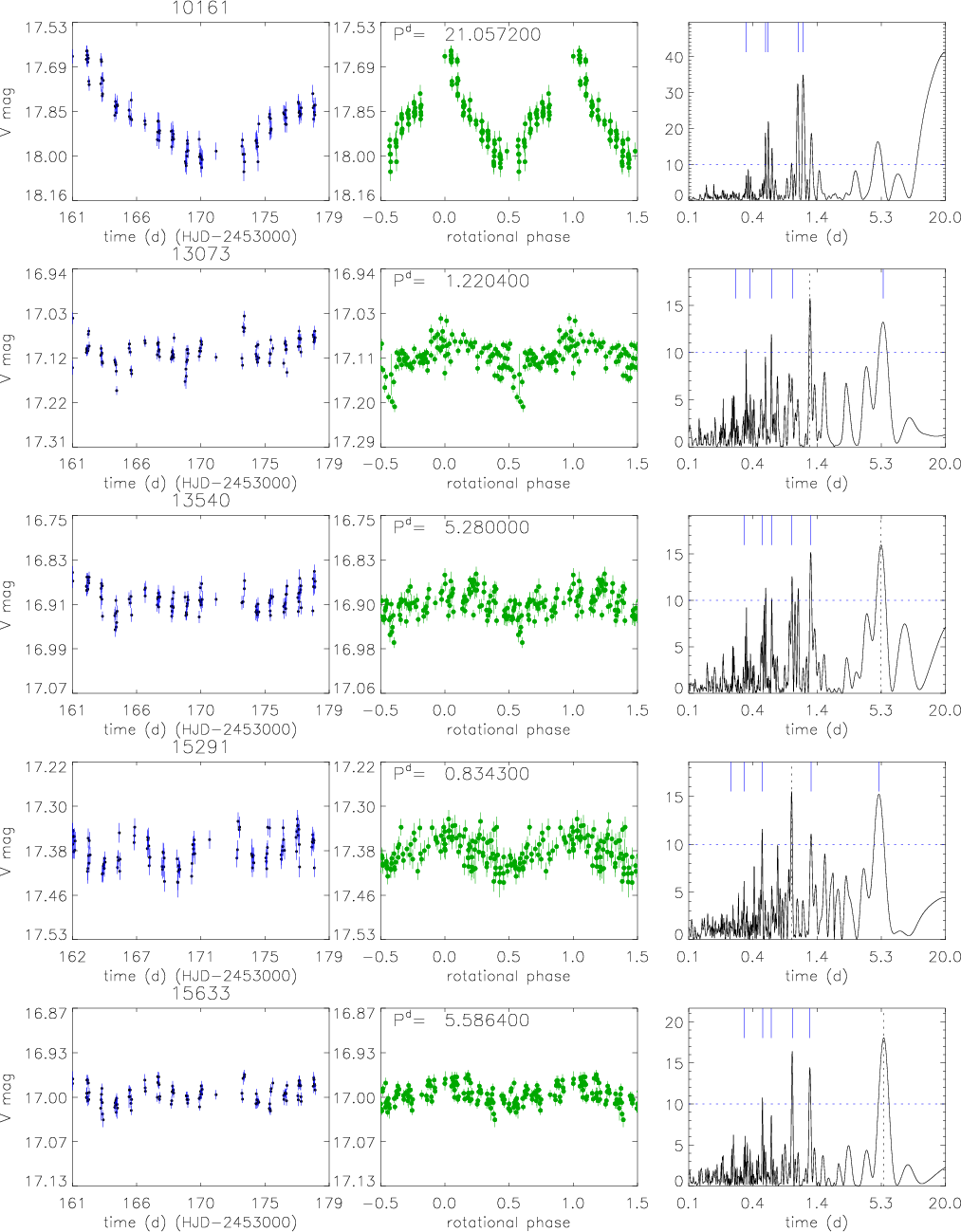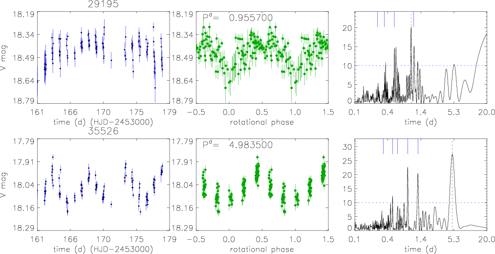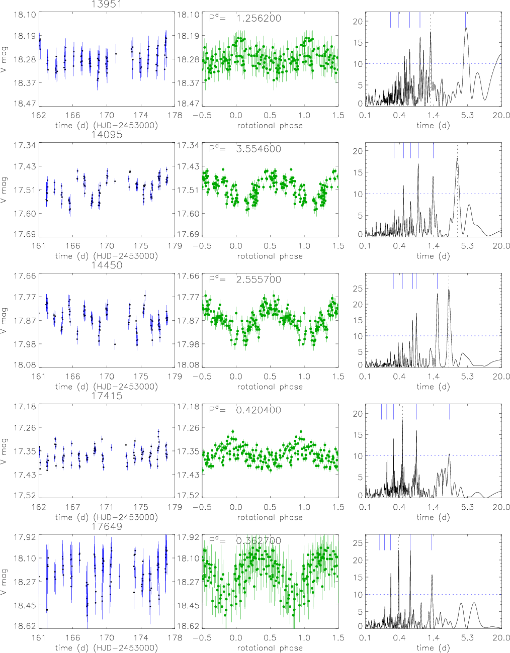 Figure 18: Periodic cluster non-members discovered in the FoV of M 11. From left panel: V-band time series, phased light curve, and Scargle periodogram. See Sect. 4 for a detailed description. |