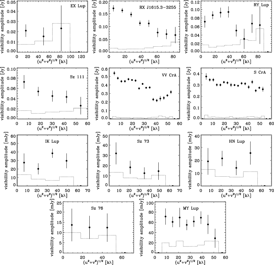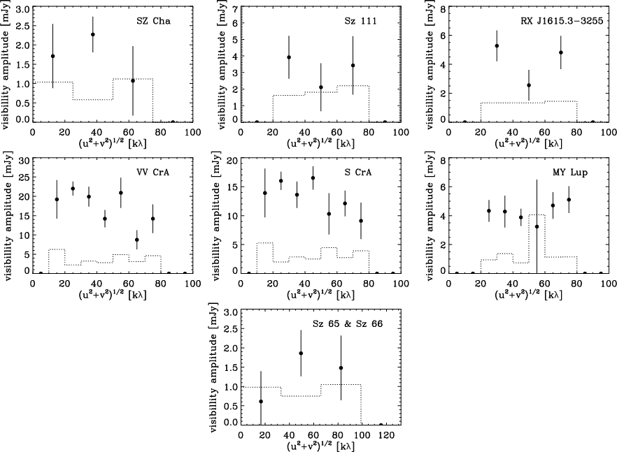upper limits are presented in Table 3 in the main text. The amplitude as a function of (u, v) distance of the sources detected with CARMA at 1 mm is plotted in Fig. B.5, that of the sources detected with CARMA at 3 mm in Fig. B.6.