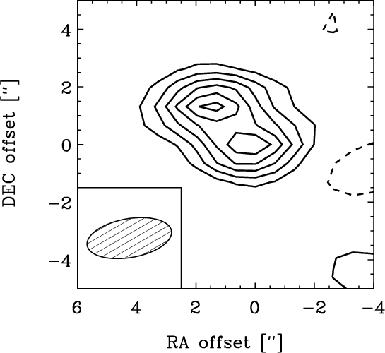 Figure B.2: Image of VV CrA, observed at 3.2 mm on 2 and 3 August 2008. The offsets are with respect to the phase centre, which is located at 19:03:06.7, -37:12:49.7. The contours are at 2, 4, 6, ... times the rms of 2.0 mJy/bm; negative contours are dashed. |