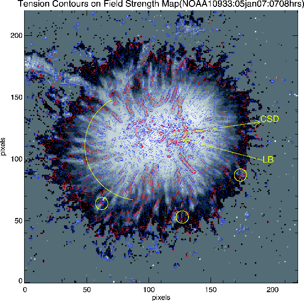 Same as that of Fig. 1, except that the continuum image is replaced by the field strength map of NOAA AR 10933. Contour levels are