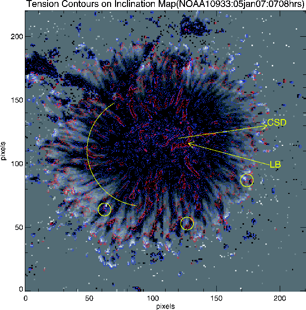 Figure A.2: Same as that of Fig. 1, except that the continuum image is replaced by the field inclination map of NOAA AR 10933. |