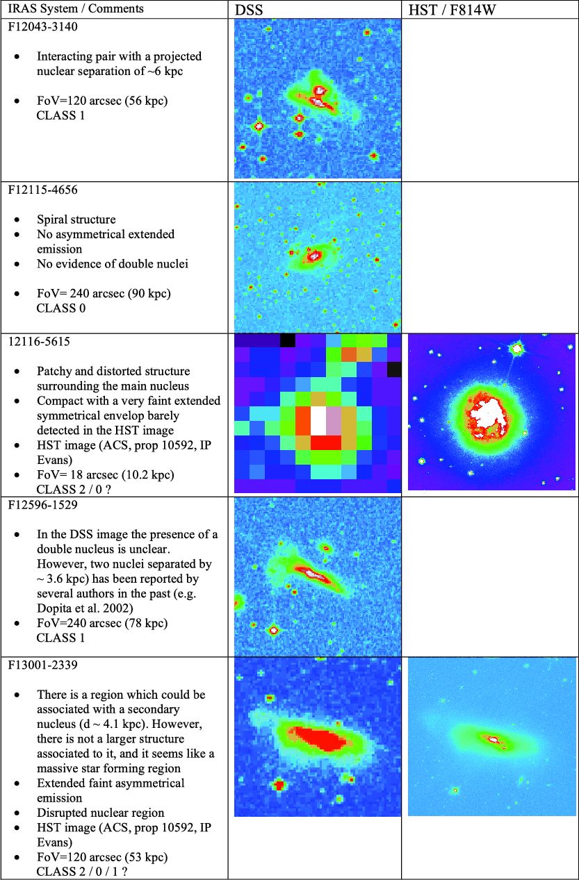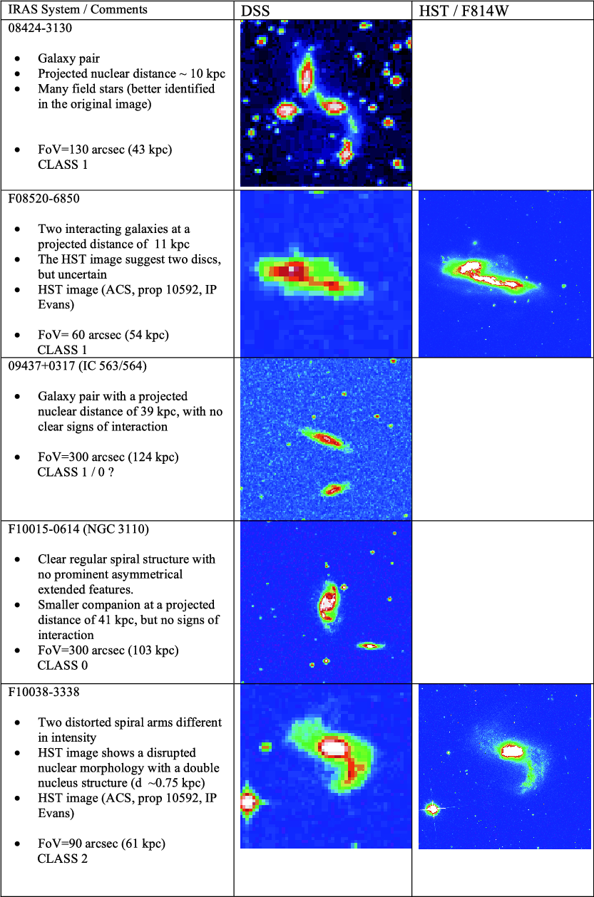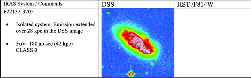 Figure 14: Panel showing the images utilized for the morphological classification. The left column contains details about the size and scale for the displayed images, as well as relevant morphological features and final classification. The central and right columns display the Digital Sky Survey and HST images, respectively. Orientation is north up, east to the left. |