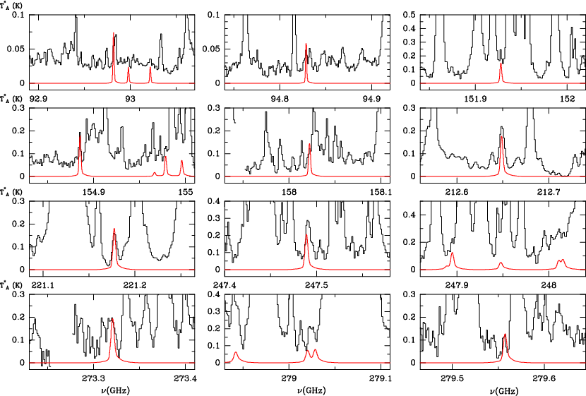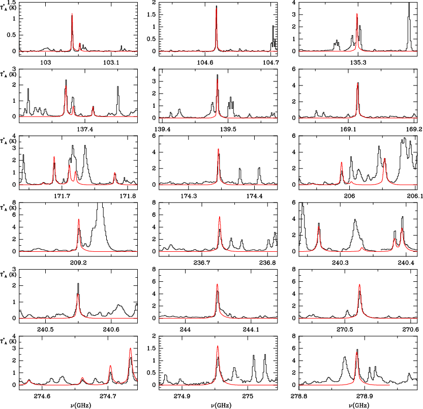 Figure A.2: Left panelshows the OCS J = 18-17 line at different positions. The right panel map shows the total integrated intensity of this transition; the interval of contours is 10 K km s-1, and the minimum contour is 40 K km s-1. |