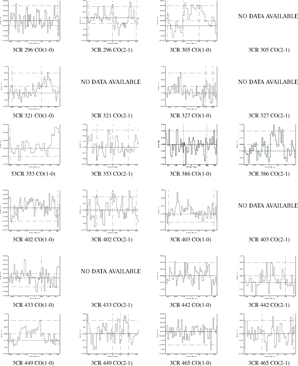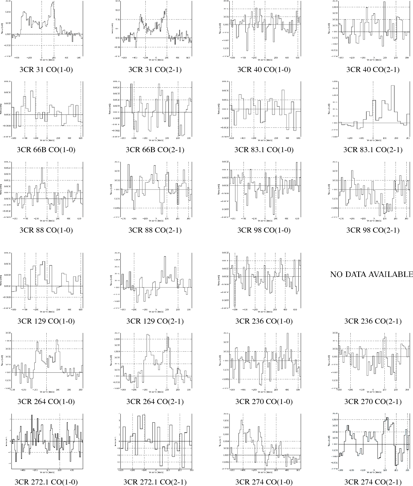 - 3C 449: It has a tentative double-horn profile that can be noticed from the CO(1-0) spectrum (Fig. 15), but one side is stronger than the other. From the HST image of this galaxy, it is possible to see the dust absorbing the visible light, not completely edge on. According to Martel et al. (1999), the morphology of this galaxy suggests that we are viewing the nearside of an inclined, geometrically thick torus or disk. The velocity width is about 500 km s-1.