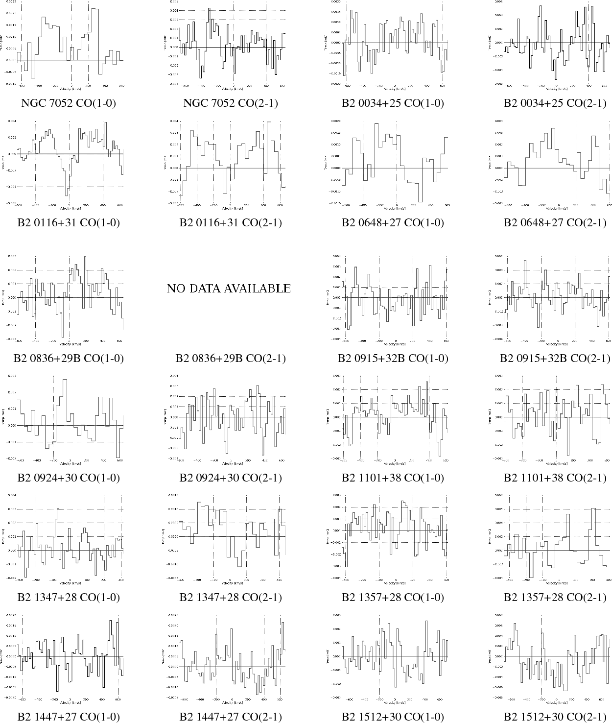 - B2 0116+31: This is a peculiar galaxy in this sample, showing a strong absorption line in CO(1-0). The molecular/dusty disk was studied in detail by García-Burillo et al. (2007) using the IRAM PdBI. The absorption line is surrounded by emission in both its blue and red-shifted wings. Because of the absorption, we cannot discard a possible double horn profile. As mentioned in Sect. 3.2, this absorption is the signature of molecular gas mass along the line of sight towards the AGN covering a very small area and because of its small filling factor, this absorption is quite rare, low, in contrast to that expected for a radio-selected sample. Its double-horn profile is also visible in the CO(2-1) transition line, where the absorption is much weaker; the continuum at this frequency is not detected, in contrast to the continuum for CO(1-0) which has a strong flux density of 164 mJy. The absorption line in this galaxy should cause an underestimation of the CO(1-0) integrated intensity and therefore an overestimation of the line ratio.