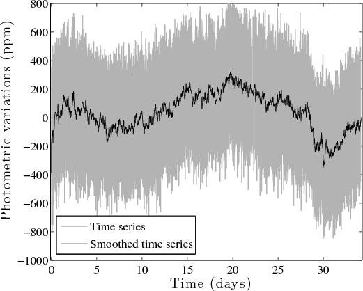 Figure 6: CoRoT time series of HD 46375 after the re-processing described in Gaulme et al. 2010. The time series is plotted in grey at full resolution, and in black after a smoothing with a 100-min long box-car. The standard deviation around the low frequency trend is 176 ppm. The epoch zero corresponds to 3203.62037 days in the CoRoT calendar, that is to say after January 1, 2000 at 12:00 GMT. |