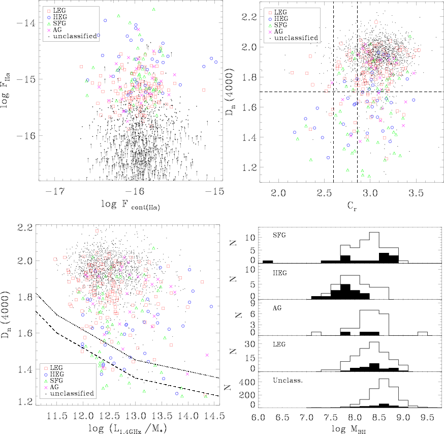 Figure A.1: Spectroscopic diagnostic diagrams for the objects with 0.1<z<0.3, with the same structure and symbols as Fig. 1. |