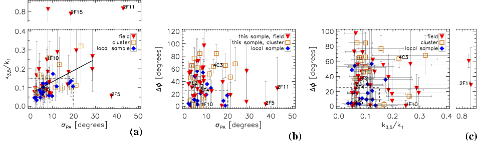 Figure B.33: a) HST-ACS image of the objects in the V band. c) Position angle of the kinematic axis as a function of radius. d) Rotation curves extracted along the central slit and the kinematic major axis. e) Velocity field of the emission line which could not be identified. The map belongs to 2F15 and 2F16 together. f) Normalized flux map of the emission line which could not be identified. The map belongs to 2F15 and 2F16 together. g) Velocity map reconstructed using 6 harmonic terms. h) Residual of the velocity map and the reconstructed map. i) Simple rotation map constructed for position angle and ellipticity fixed to their global values. j) Residual of the velocity map and the simple rotation map. k) Position angle and flattening as a function of radius. l) k3/k1 and k5/k1 (from the analysis where position angle and ellipticity are fixed to their global values) as a function of radius. |