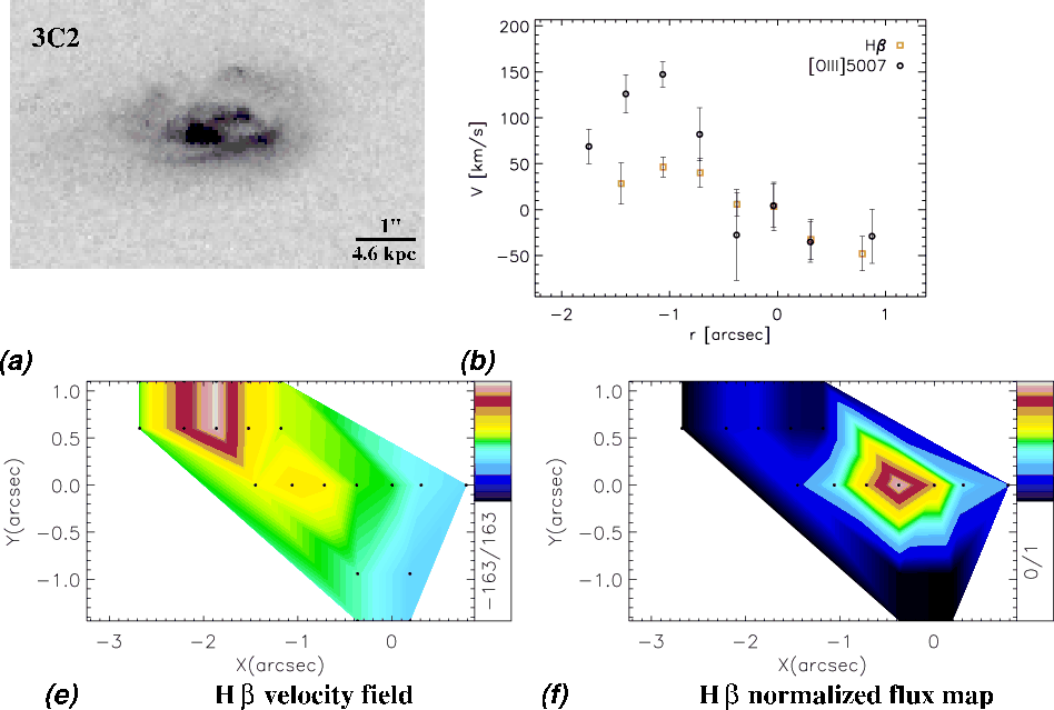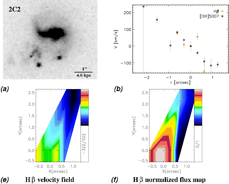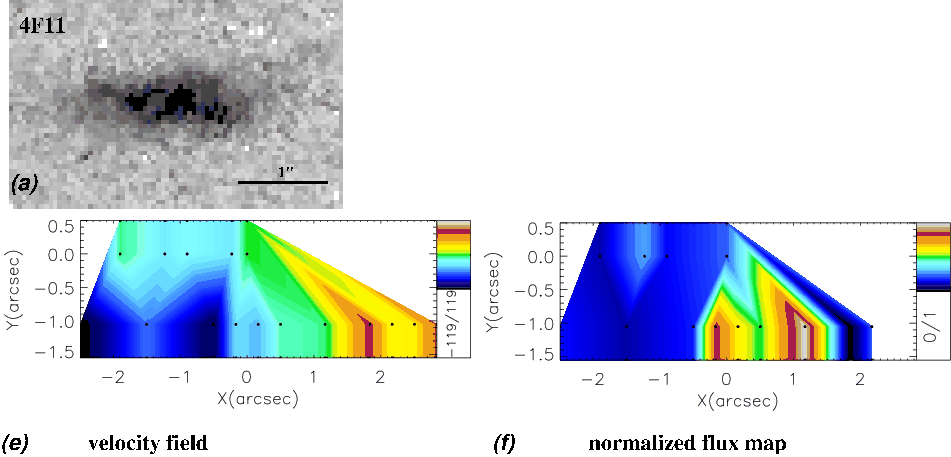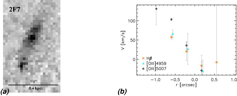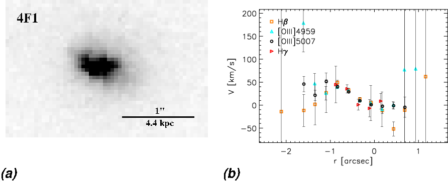 Here we present some figures showing the data and its analysis for each object in our sample. The HST image and the velocity field of each galaxy have the same orientation (the slit position is parallel to the x-axis). The velocities and the positions are given with respect to the continuum center of the galaxies.