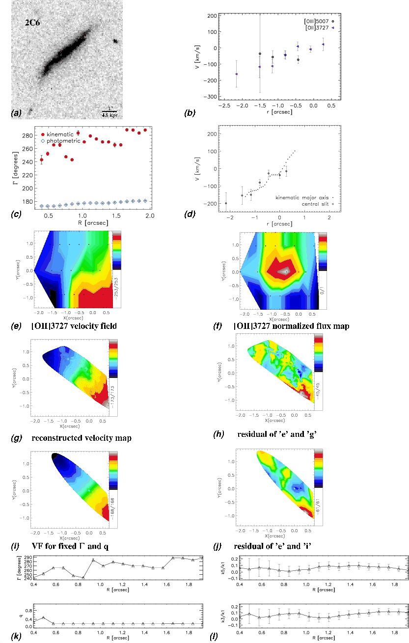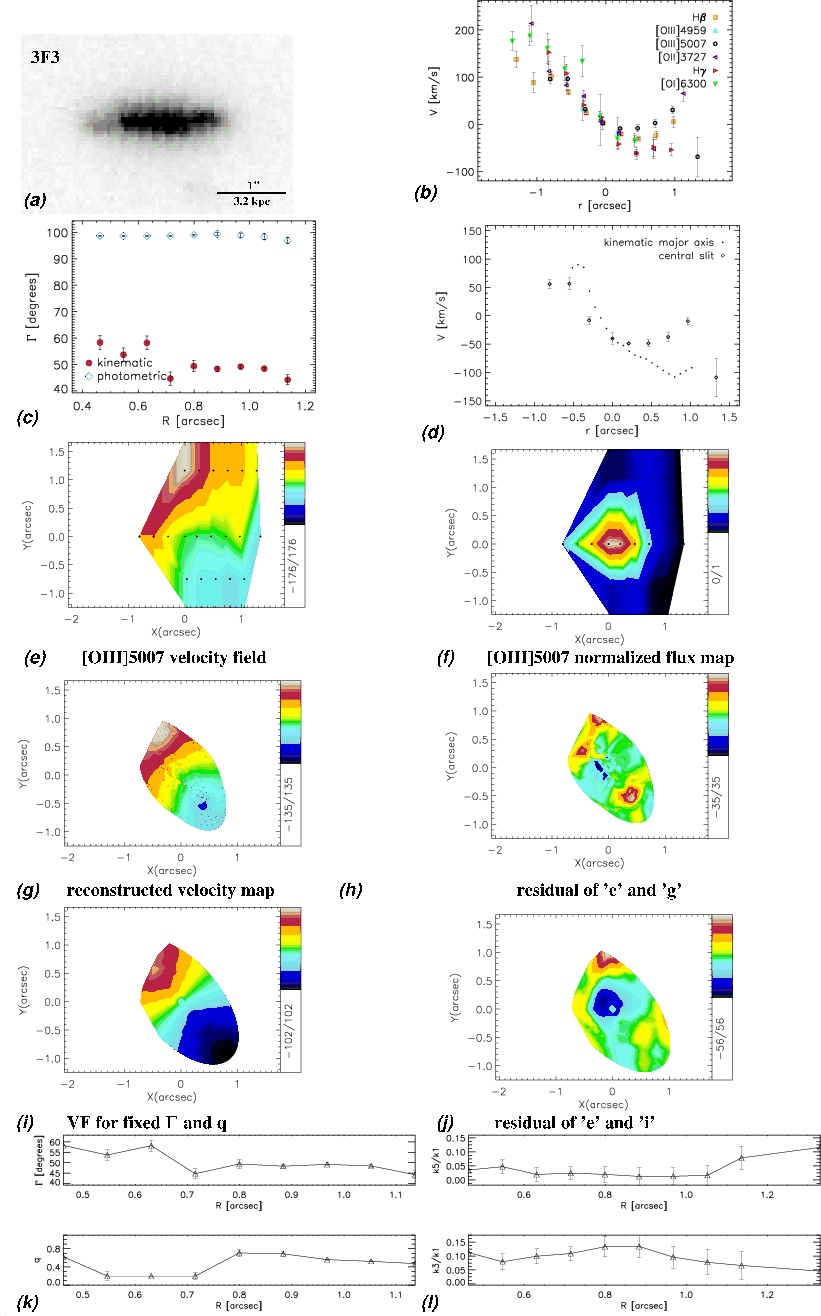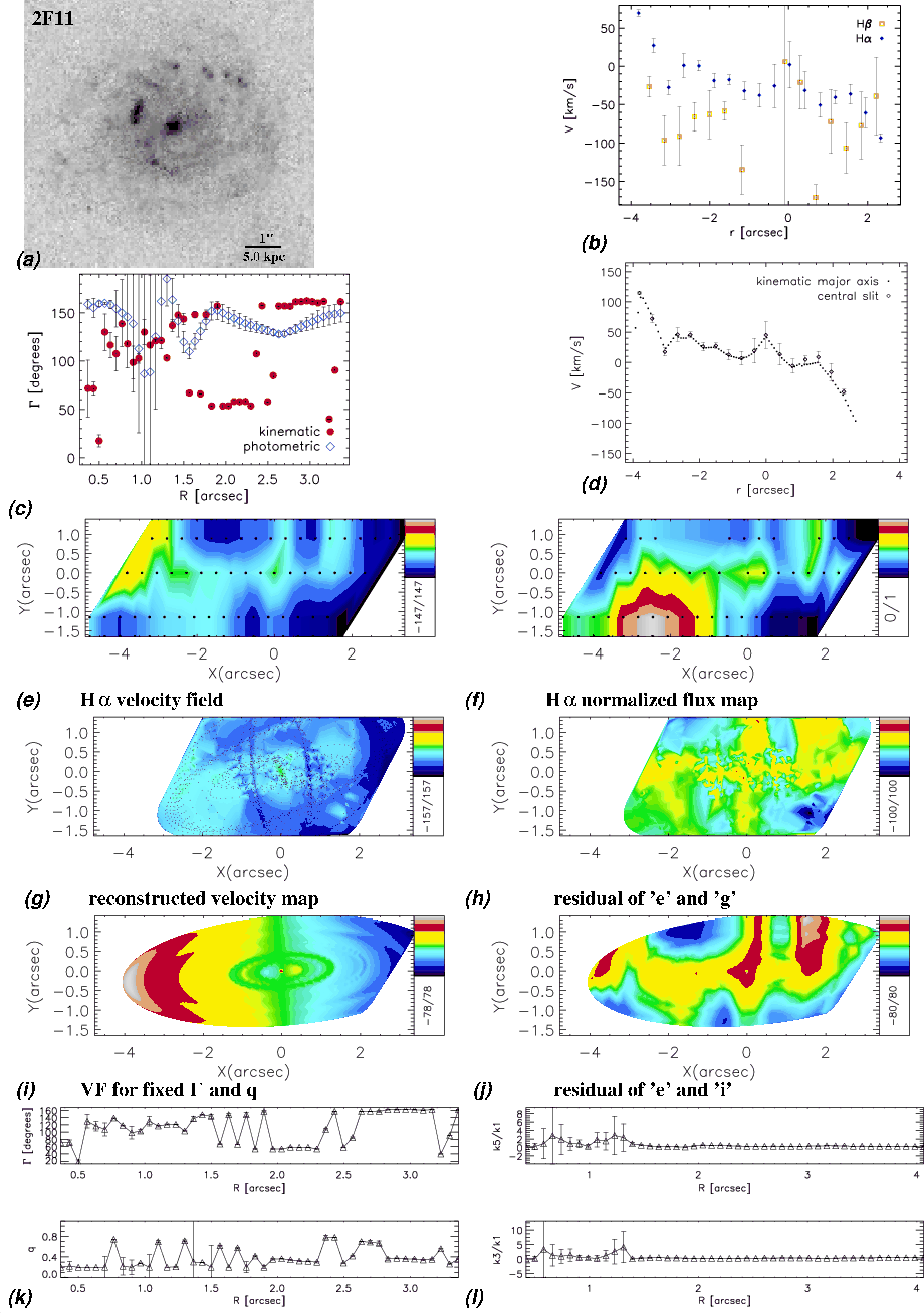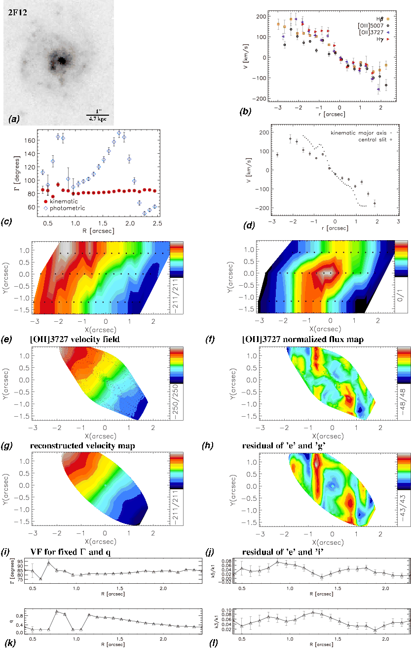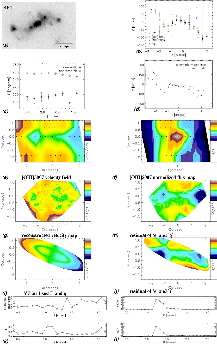 Figure B.7: a) HST-ACS image of the galaxy in the V band. b) Rotation curves of different emission lines extracted along the central slit. c) Position angles of kinematic and photometric axes as a function of radius. d) Rotation curves extracted along the central slit and the kinematic major axis. e) [OIII]5007 velocity field. f.1) Normalized [OII]3727 flux map. f.2) Normalized [OIII]5007 flux map. g) Velocity map reconstructed using 6 harmonic terms. h) Residual of the velocity map and the reconstructed map. i) Simple rotation map constructed for position angle and ellipticity fixed to their global values. j) Residual of the velocity map and the simple rotation map. k) Position angle and flattening as a function of radius. l) k3/k1 and k5/k1 (from the analysis where position angle and ellipticity are fixed to their global values) as a function of radius. |