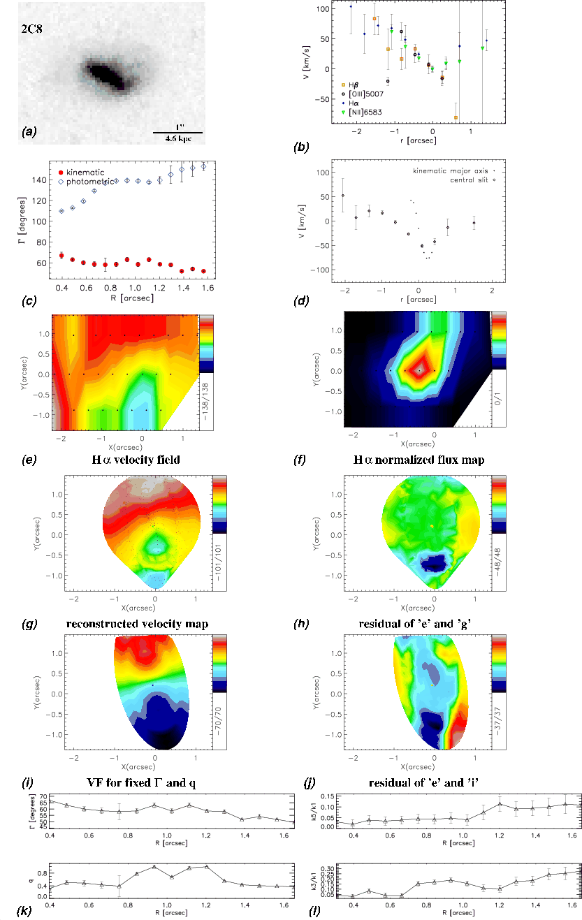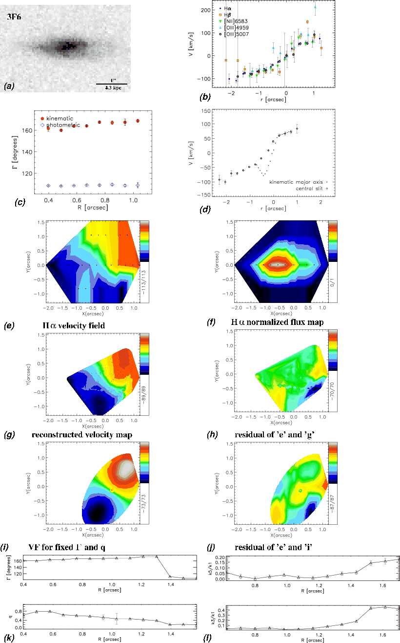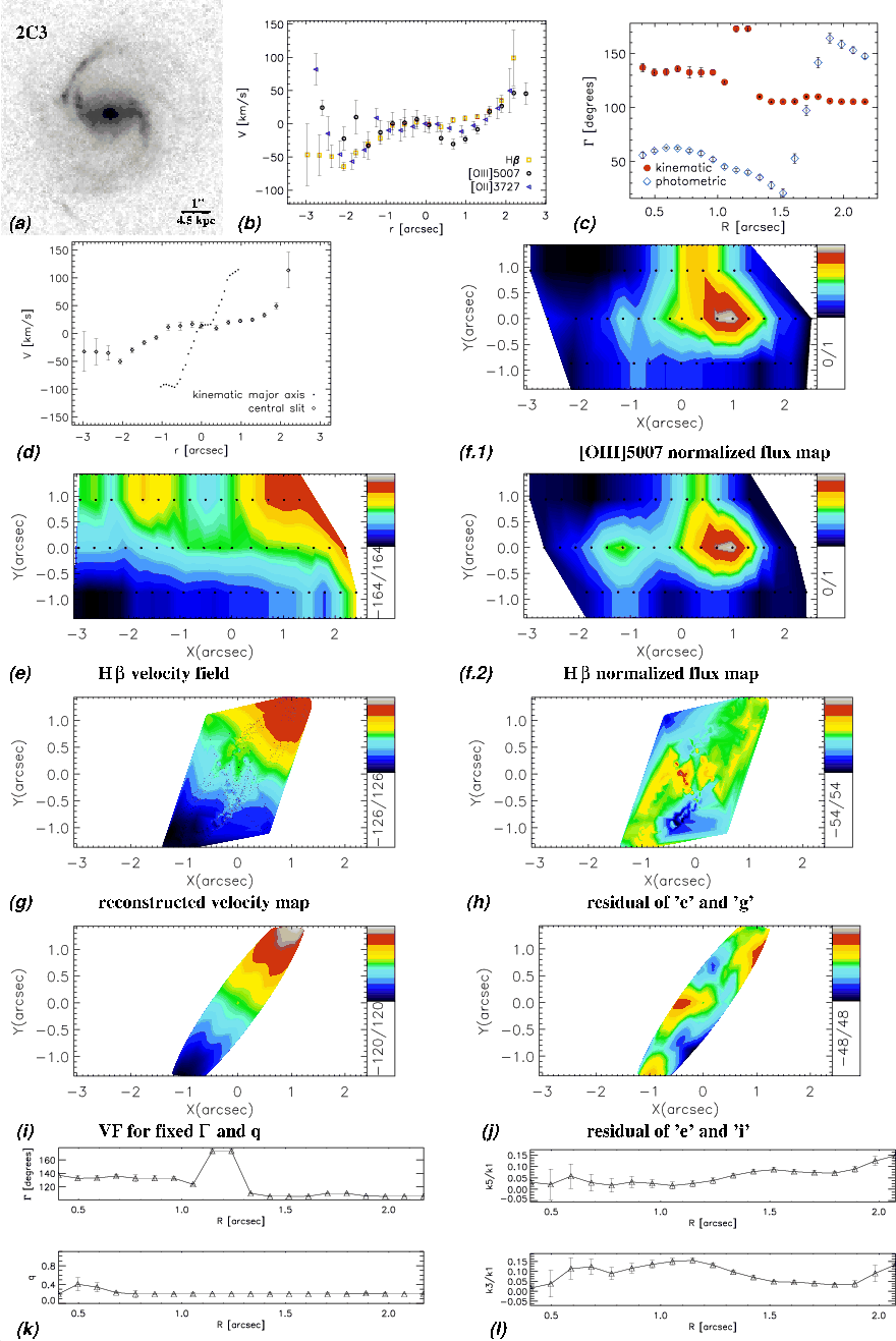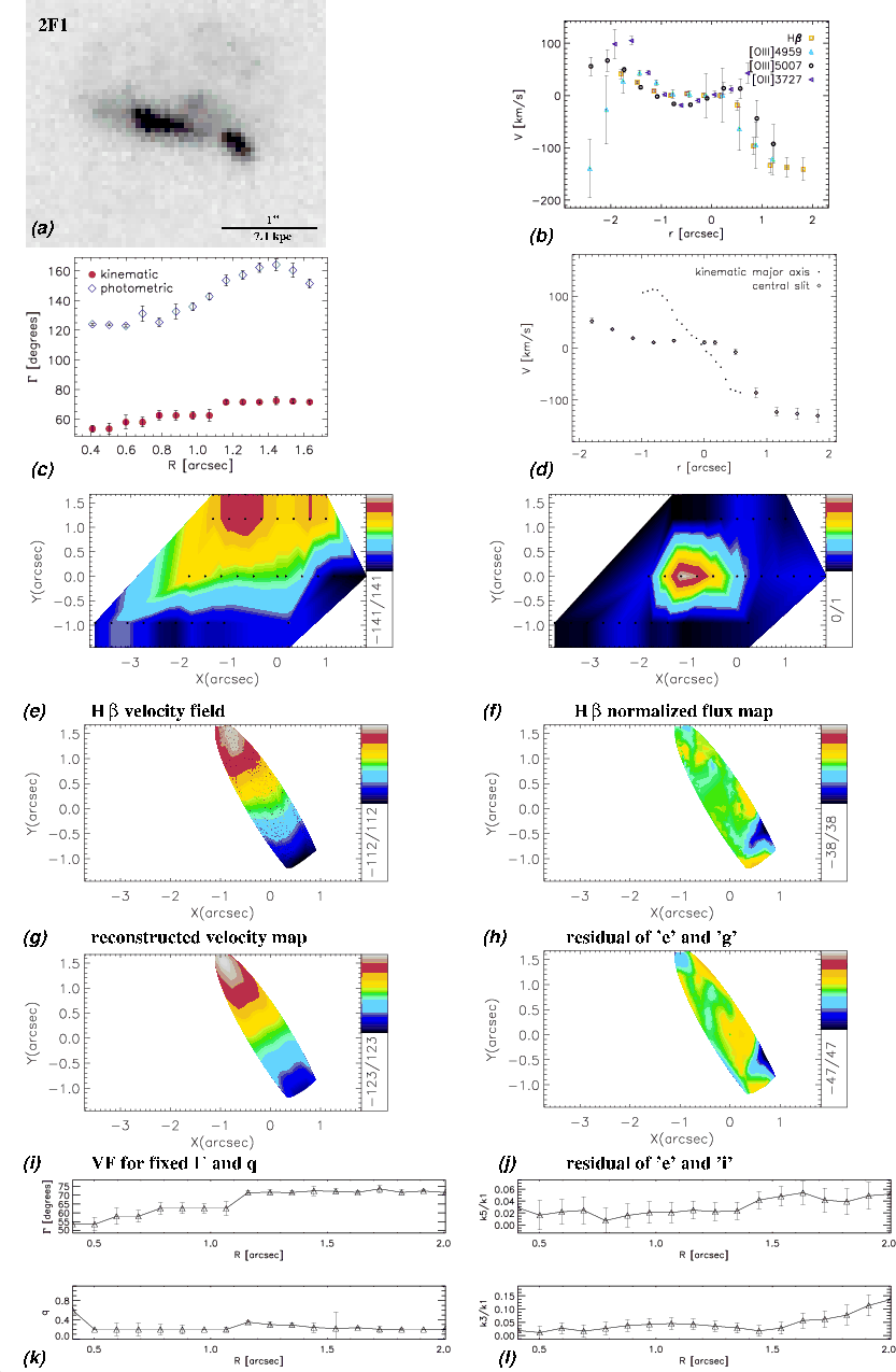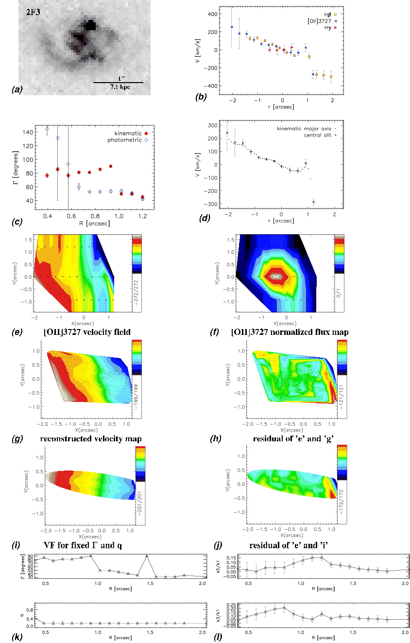 Figure B.7: a) HST-ACS image of the galaxy in the V band. b) Rotation curves of different emission lines extracted along the central slit. c) Position angles of kinematic and photometric axes as a function of radius. d) Rotation curves extracted along the central slit and the kinematic major axis. e) [OIII]5007 velocity field. f.1) Normalized [OII]3727 flux map. f.2) Normalized [OIII]5007 flux map. g) Velocity map reconstructed using 6 harmonic terms. h) Residual of the velocity map and the reconstructed map. i) Simple rotation map constructed for position angle and ellipticity fixed to their global values. j) Residual of the velocity map and the simple rotation map. k) Position angle and flattening as a function of radius. l) k3/k1 and k5/k1 (from the analysis where position angle and ellipticity are fixed to their global values) as a function of radius. |