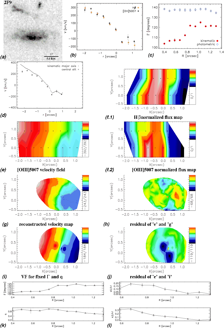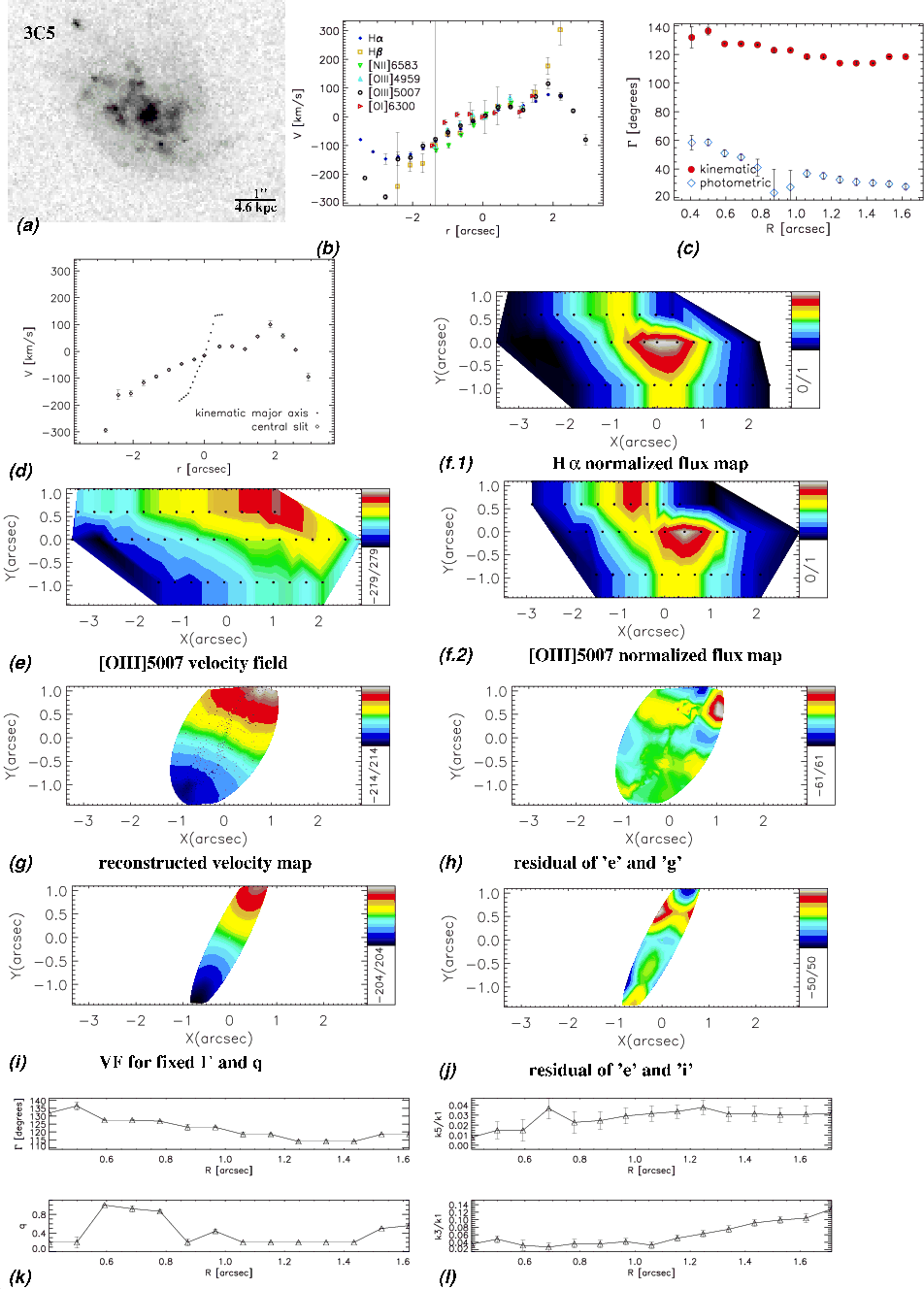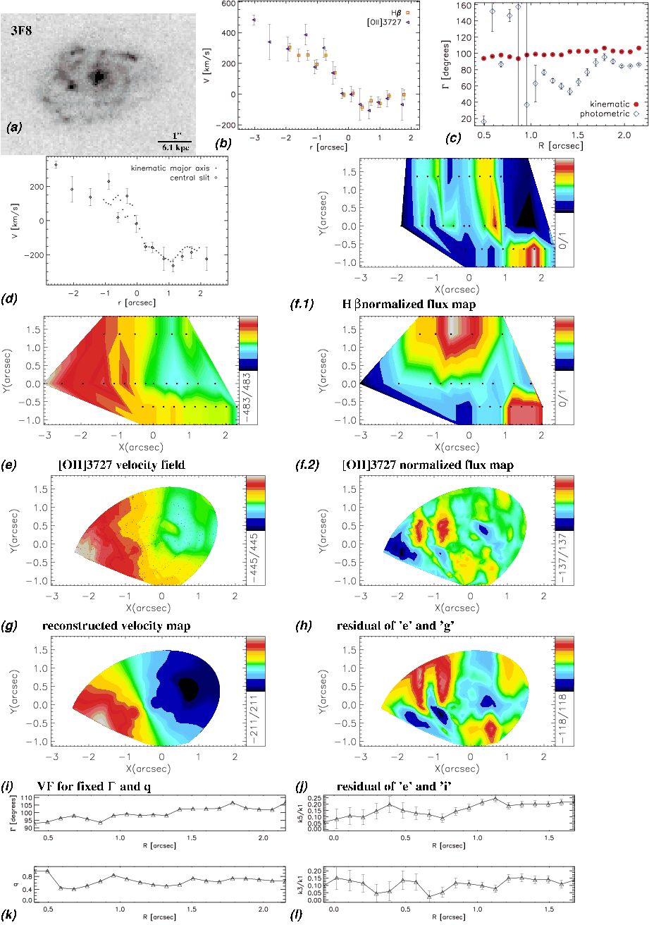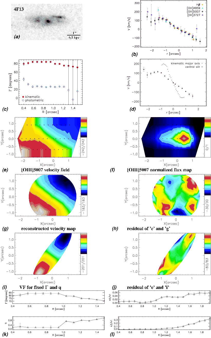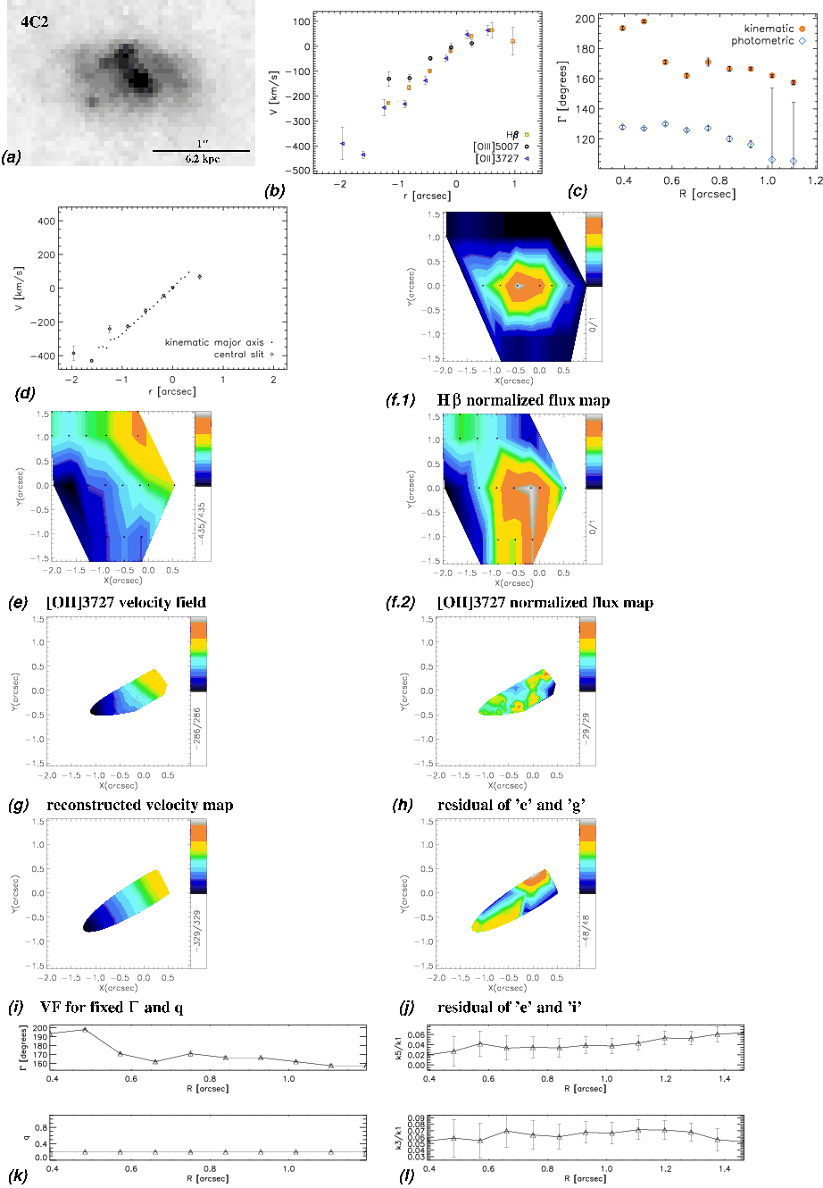 Figure B.7: a) HST-ACS image of the galaxy in the V band. b) Rotation curves of different emission lines extracted along the central slit. c) Position angles of kinematic and photometric axes as a function of radius. d) Rotation curves extracted along the central slit and the kinematic major axis. e) [OIII]5007 velocity field. f.1) Normalized [OII]3727 flux map. f.2) Normalized [OIII]5007 flux map. g) Velocity map reconstructed using 6 harmonic terms. h) Residual of the velocity map and the reconstructed map. i) Simple rotation map constructed for position angle and ellipticity fixed to their global values. j) Residual of the velocity map and the simple rotation map. k) Position angle and flattening as a function of radius. l) k3/k1 and k5/k1 (from the analysis where position angle and ellipticity are fixed to their global values) as a function of radius. |