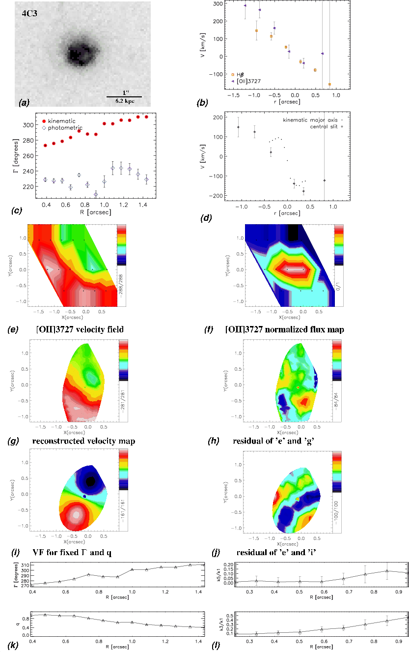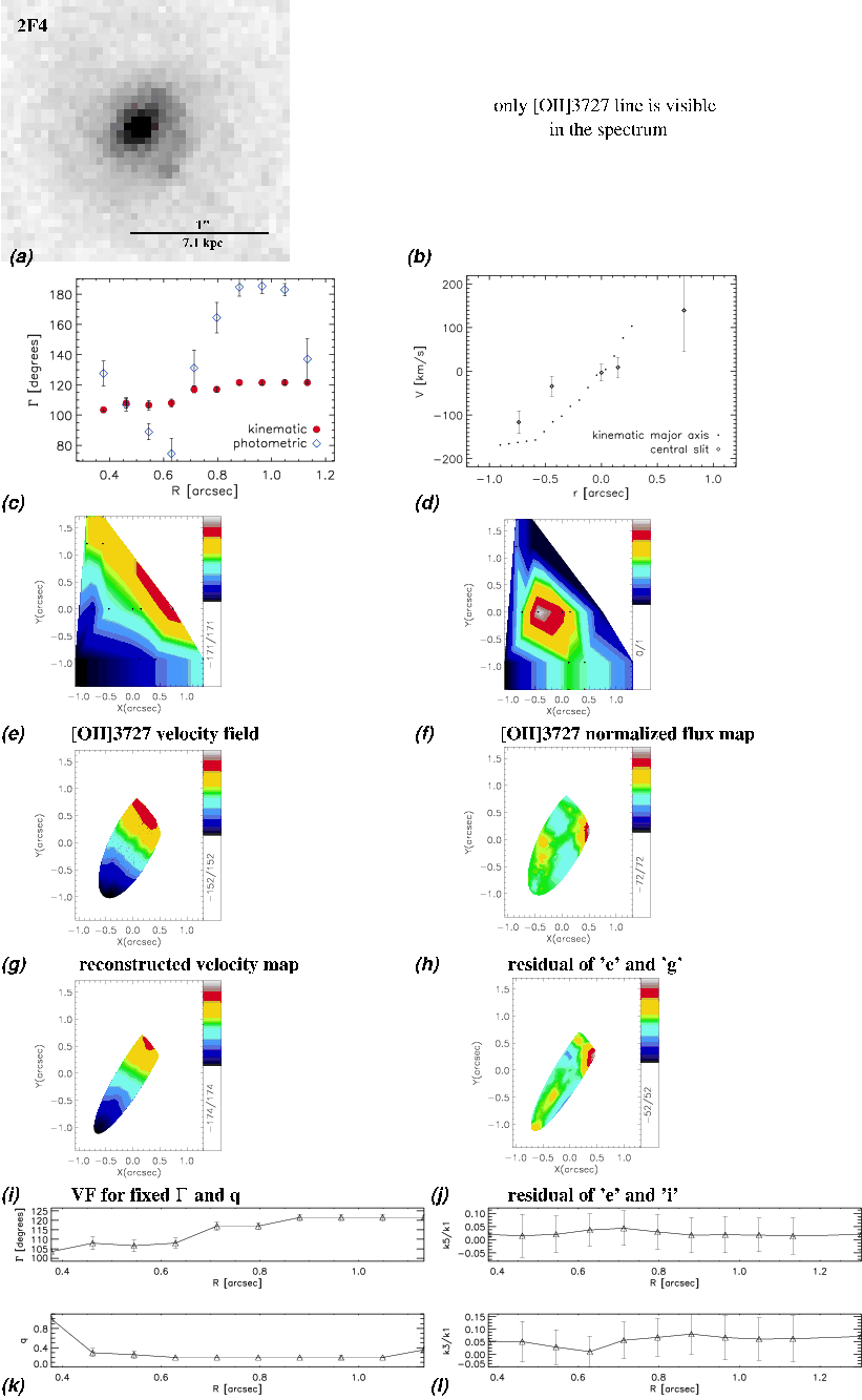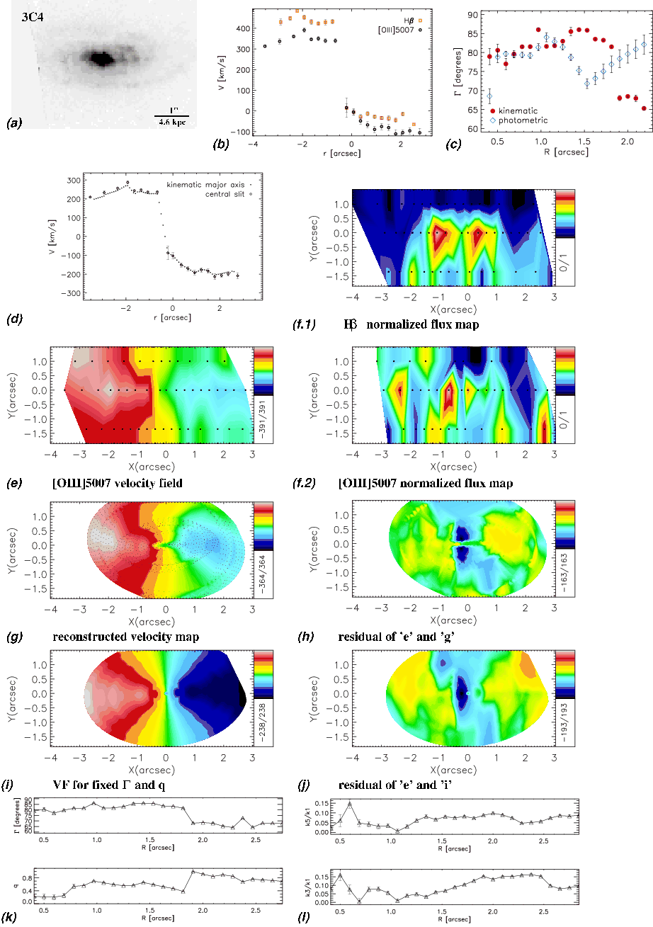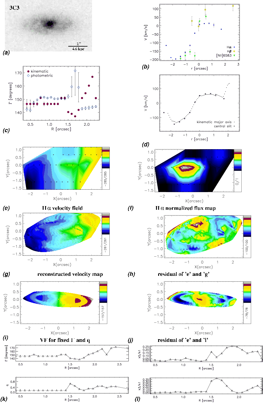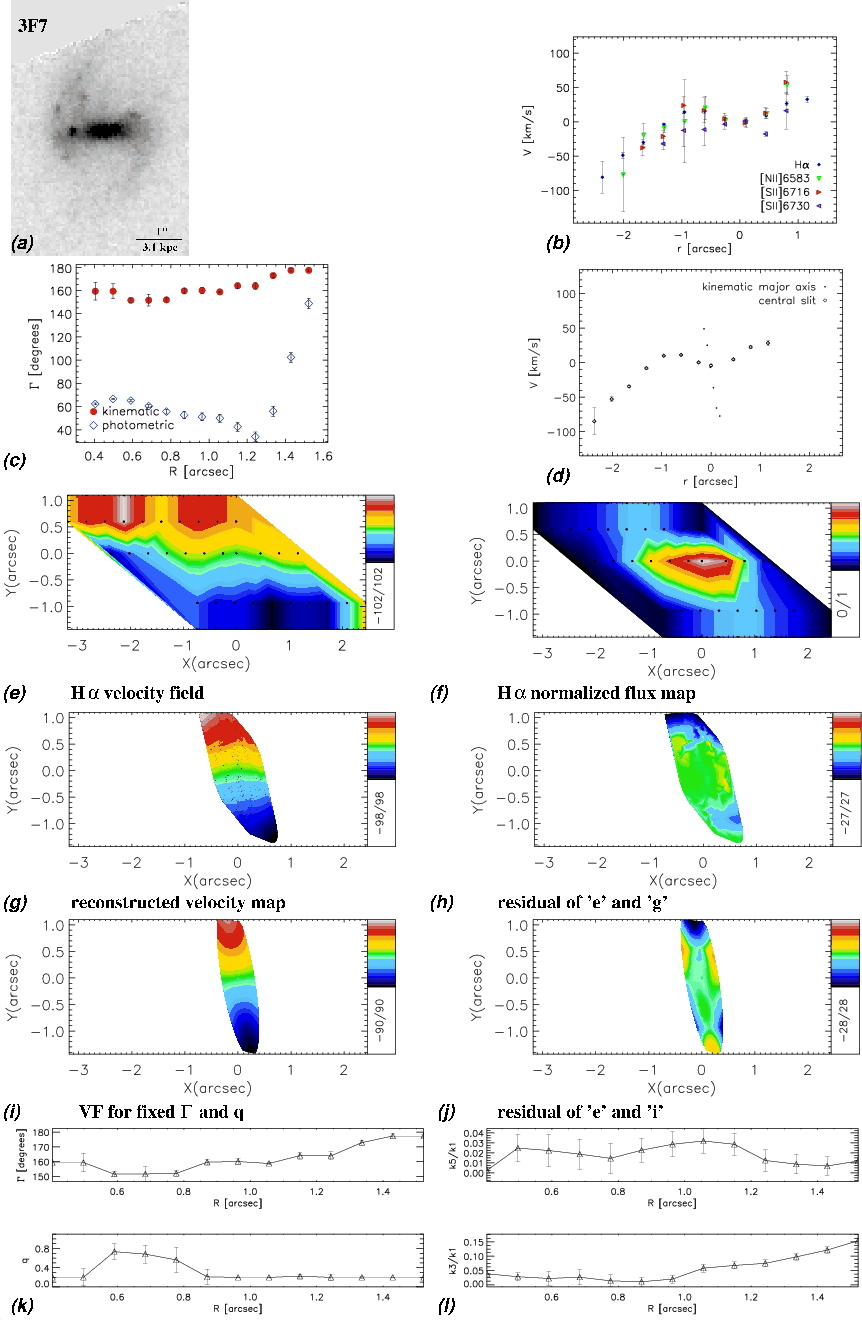 Figure B.7: a) HST-ACS image of the galaxy in the V band. b) Rotation curves of different emission lines extracted along the central slit. c) Position angles of kinematic and photometric axes as a function of radius. d) Rotation curves extracted along the central slit and the kinematic major axis. e) [OIII]5007 velocity field. f.1) Normalized [OII]3727 flux map. f.2) Normalized [OIII]5007 flux map. g) Velocity map reconstructed using 6 harmonic terms. h) Residual of the velocity map and the reconstructed map. i) Simple rotation map constructed for position angle and ellipticity fixed to their global values. j) Residual of the velocity map and the simple rotation map. k) Position angle and flattening as a function of radius. l) k3/k1 and k5/k1 (from the analysis where position angle and ellipticity are fixed to their global values) as a function of radius. |