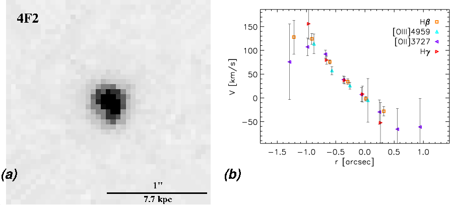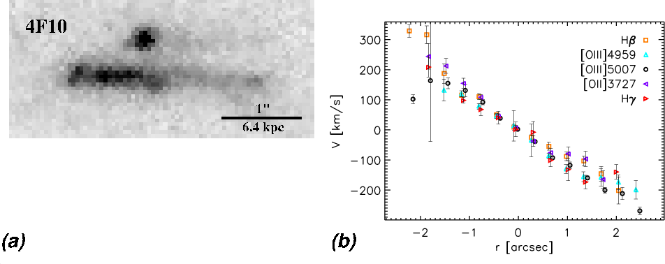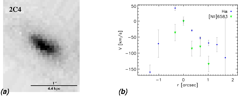 Figure B.4: a) HST-ACS image of the galaxy in the V band. b) Rotation curves of different emission lines extracted along the centralslit. |