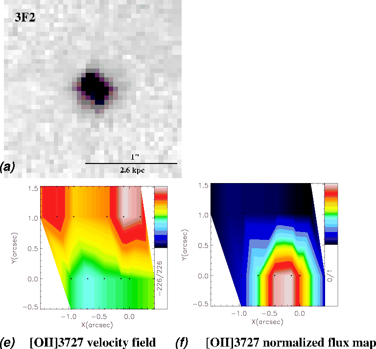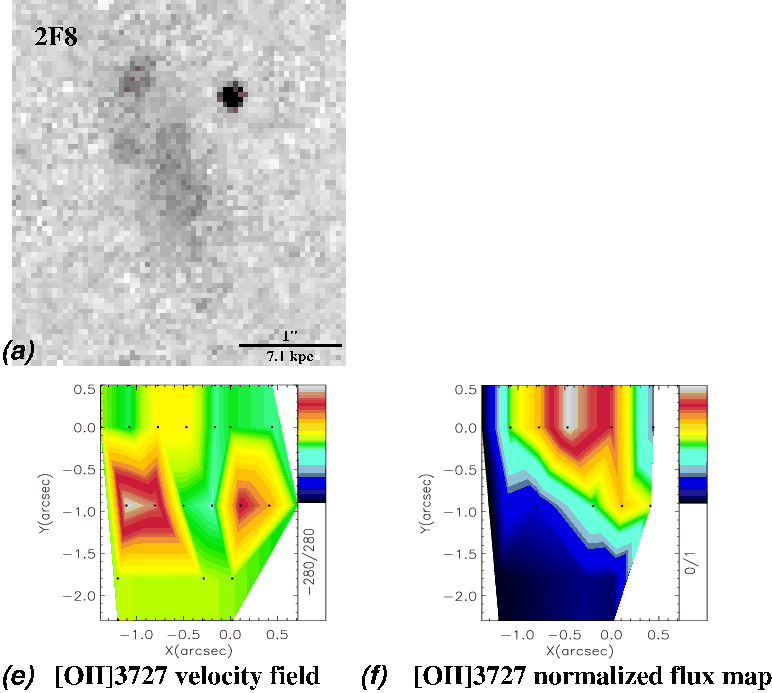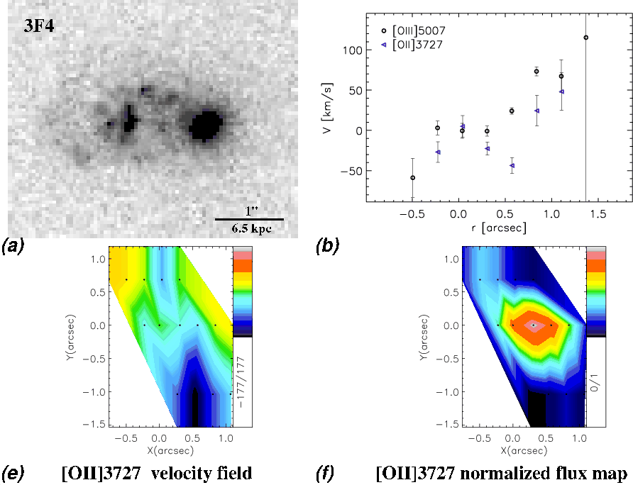 Figure B.26: a) HST-ACS image of the galaxy in the V band. e) [OII]3727 velocity field. f) Normalized [OII]3727 flux map. |