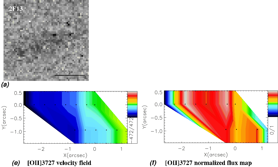 Figure B.31: a) HST-ACS image of the galaxy in the V band. e) [OII]3727 velocity field. f) Normalized [OII]3727 flux map. |