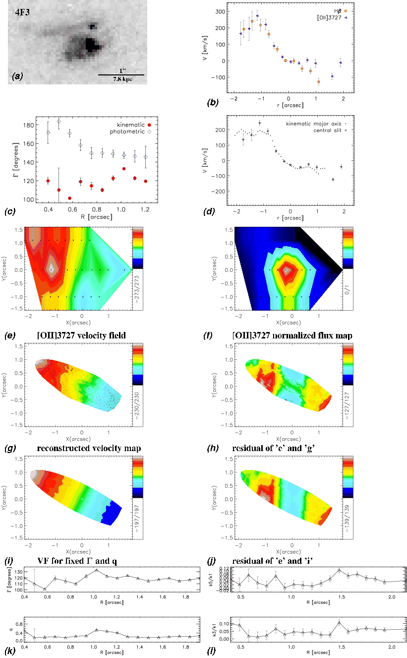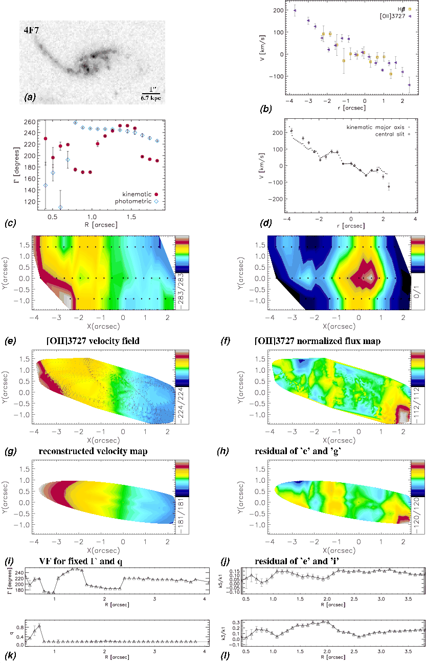 Figure B.6: a) HST-ACS image of the galaxy in the V band. b) Rotation curves of different emission lines extracted along the central slit. c) Position angles of kinematic and photometric axes as a function of radius. d) Rotation curves extracted along the central slit and the kinematic major axis. e) [OII]3727 velocity field. f) Normalized [OII]3727 flux map. g) Velocity map reconstructed using 6 harmonic terms. h) Residual of the velocity map and the reconstructed map. i) Simple rotation map constructed for position angle and ellipticity fixed to their global values. j) Residual of the velocity map and the simple rotation map. k) Position angle and flattening as a function of radius. l) k3/k1 and k5/k1 (from the analysis where position angle and ellipticity are fixed to their global values) as a function of radius. |