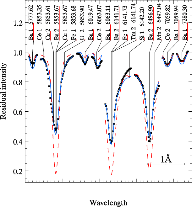 Figure 4: Comparison between the observed and theoretical profiles for the Ba lines. Observations are shown with symbols, thick full line corresponds to the synthetic spectrum calculated with the best-fitting stratified abundance distribution and dashed line shows prediction of the spectrum synthesis with a homogeneous abundance. |