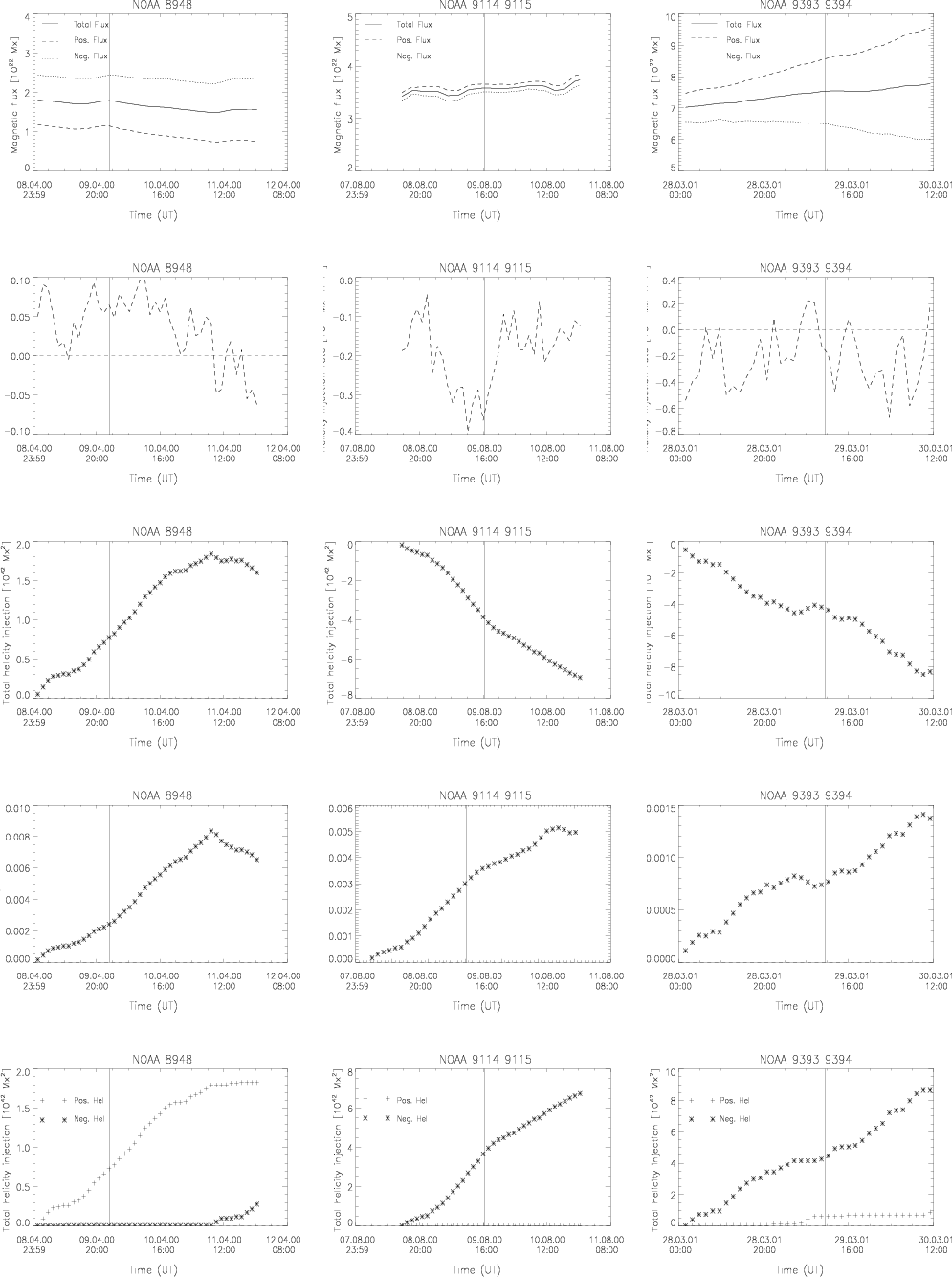 accumulated helicity injection (fifth row) for NOAA 8948, 9114+9115 and
