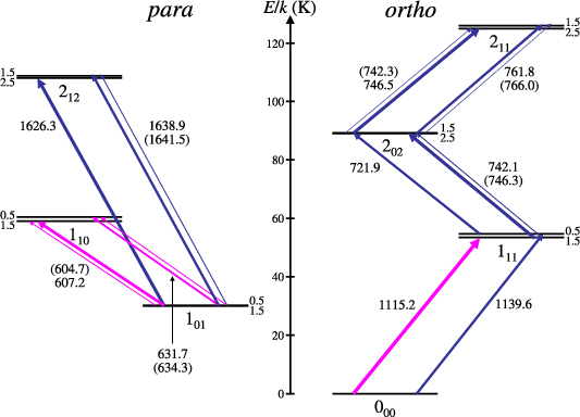 Figure A.1: Detail of the energy level diagram of H2O+. Hyperfine splitting has been omitted for the ortho-levels. Rotational level assignments NKaKc are given below the levels, fine structure level assignments J to the side. Magenta arrows mark transitions observed in the course of the present investigation. All other transitions shown can be observed with HIFI. The thickness of the arrows indicates the relative strengths of the transitions and the numbers the approximate frequencies. Frequencies of the weaker components are given in parentheses. The only transitions connecting to levels with N = 1 which are not shown are 221-110 and 220-111 near 2.85 and 3.0 THz which are not observable with HIFI but with PACS. |