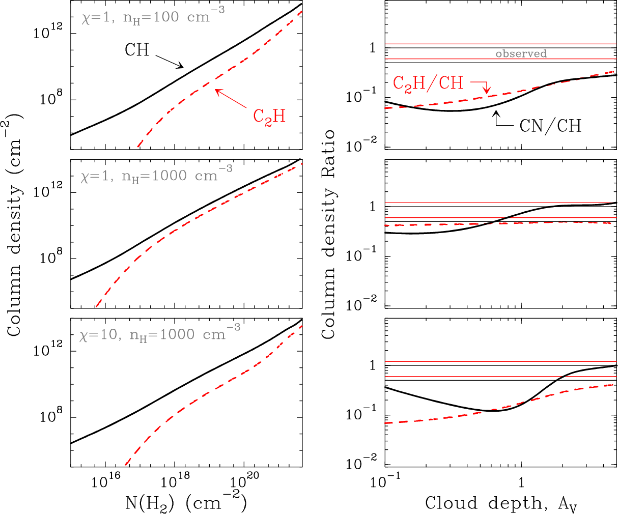 CCH (red dashed line) column density as a function of