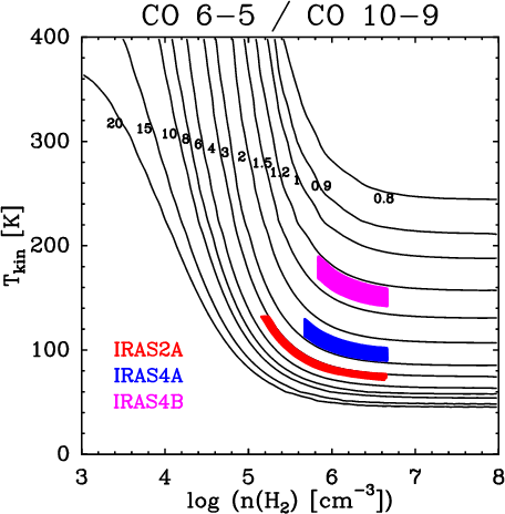 Figure A.1: Model line ratios of CO 6-5/10-9 for a slab model with a range of temperatures and densities. The adopted CO column density is 1017 cm-2 with a line width of 10 km s-1, comparable to the inferred values. For these parameters the lines involved are optically thin. The colored lines give the range of densities within the 20'' beam for the three sources based on the models of Jørgensen et al. (2002). |