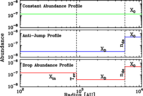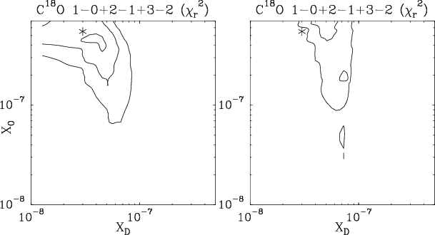 The anti-jump model is commonly adopted in models of pre-stellar cores without a central heating source (e.g., Tafalla et al. 2004; Bergin & Snell 2002). Following Jørgensen et al. (2005c), an anti-jump abundance profile was employed by varying the desorption density,The best fit to the three lowest C18O lines (1-0, 2-1 and 3-2)