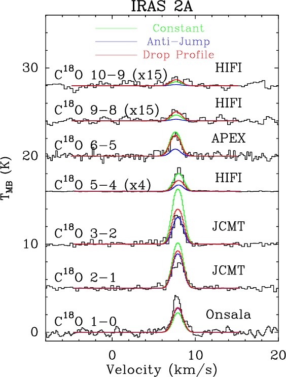 The simplest approach is to adopt a constant abundance across the entire envelope. However, with this approach, and within the framework of the adopted source model, it is not possible to simultaneously reproduce all line intensities. This was already shown by Jørgensen et al. (2005c). For lower abundances it is possible to reproduce the lower-J lines, while higher abundances are required for higher-J lines. In Fig. B.2 the C18O spectra of a constant-abundance profile are shown for an abundance ofB.2 Anti-jump abundance models