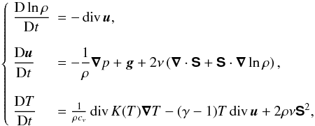 where ρ, u, and T denote density, velocity, and temperature, respectively, while K(T) is given by Eq. (A.1). The operator D/Dt = ∂/∂t + u·∇ is the usual total derivative, while S is the (traceless) rate-of-strain tensor given by