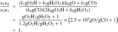 To satisfy this condition (at least approximately), gO/gCO should be very small. In Fig. A.2 the ratio (κ1κ4)/(κ2κ3) and the value of 2.5 × 108 gO/gCO are plotted as a function of time. The abundances of O, gO, gO2, gH, and gOH are also plotted for reference (not to scale). It can be seen that the (κ1κ4)/(κ2κ3) ratio does decrease, and it approaches a value of unity before the time of the spike/jump feature, and the gO/gCO ratio drops to a very low value monotonically.
