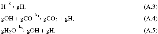 Because atomic hydrogen is central to the surface chemistry, we first look at the most important reactions governing its abundance on the grain. The main reactions consuming atomic hydrogen on the grains are (in the following a species name preceded by a “g” means a species on the grain, otherwise it is in the gas phase),