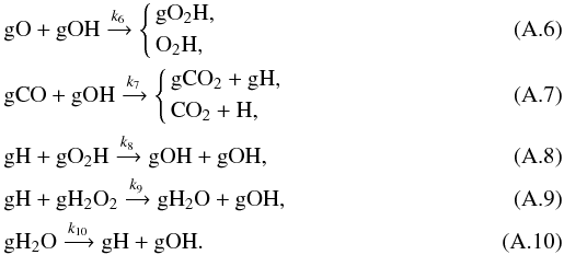 As the abundance of atomic H in the gas phase and the abundance of gCO and gH2O change relatively smoothly, they can be viewed as constant on a short time scale. The main reactions for the consumption and production of gOH are