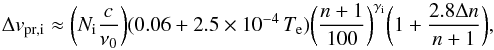 (A.3)where γi = 6−2.7 × 10-5 Te−0.13(n + 1)/100. For Te = 9000 K and Ni = 107 cm-3, the H30α line is virtually free from ion broadening (0.04 km s-1, and decreases close to linearly with decreasing Te), whereas the H53α line is broadened by 5.1 km s-1.