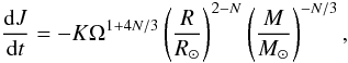 (A.1)with Ω the angular velocity and K a constant that combines scale factors for the wind velocity and magnetic field strength. This is adjusted to give the solar surface rotation velocity at the solar age. N denotes the wind index and is a measure of the magnetic geometry. N = 3/2 for the Sun. The mass loss dependence rate is very weak, and we assumed the rate Ṁ to be 10-14 M⊙ yr-1.