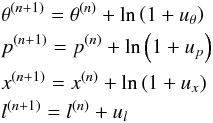 with uθ, up, ux, and ul being the quantities to be iterated that are given by uθ = ΔT/T(n), up = ΔP/P(n), ux = ΔR/R(n), and ul = l, where superscripts n and n + 1 denote the beginning and end of time interval. Here, θ = ln T, x = ln R, and p = ln P. Thus, the Newton-Raphson iteration scheme is applied to the differences in the luminosity, pressure, temperature, and radius between the previous and the computed model. For the white dwarf regime, a centred scheme is used for the equations of stellar structure and evolution. Models are divided into approximately 1000–1500 mesh points.