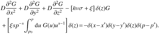 The Green’s function G(r,r′,p,p′) for Eq. (1) satisfies (A.1)where G(u) ≡ G(r,r′,u,p′). In rectangular coordinates, and assuming the sources are on the Galactic plane, i.e., z′ = 0, we can write the above equation as