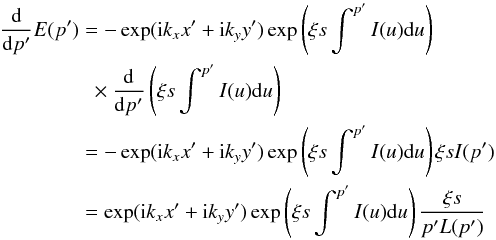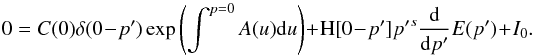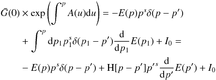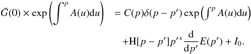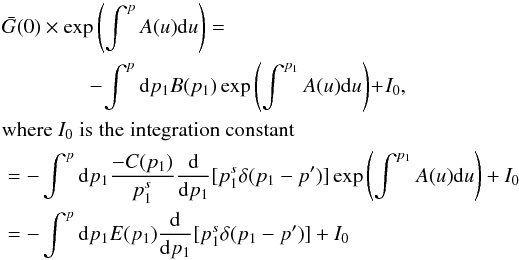 (A.14)In the present study, as we assume that particles are injected with a finite momentum p′ ≥ p0 where p0 is the low-momentum cutoff we have introduced so as to approximate the ionization losses (see Sect. 2), the delta function and the Heaviside step function in the first two terms on the right hand side of the above equation becomes zero. This gives I0 = 0, and the general solution of Eq. (A.6) becomes,