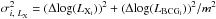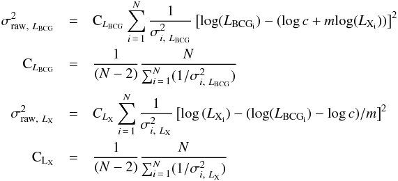 . Here, N is the sample size, c is the normalisation, m is the slope and the deltas represent the errors on the quantities. The statistical scatter, σstat, is estimated by calculating the root-mean-square of σi. The intrinsic scatter is given as the difference between the raw and the statistical scatters in quadrature. We simply replace M500 in place of LX in the formula to calculate scatter for the M500 − LBCG relation.