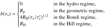 Given a known encounter velocity, the calculation of the collision probability only requires that of the planetesimal effective capture radius. We know that it is extremely small in the hydro regime and equal to Rp in the geometric regime. In the settling regime, it is given by Eq. (90). As shown in Fig. 9, the settling regime may be subdivided into a Bondi regime in which the capture radius is proportional to , and a Hill regime in which the capture radius is approximatively independent of τs and equal to the Hill radius. We thus approximate the effective capture radius of planetesimals/embryos in the different regimes as