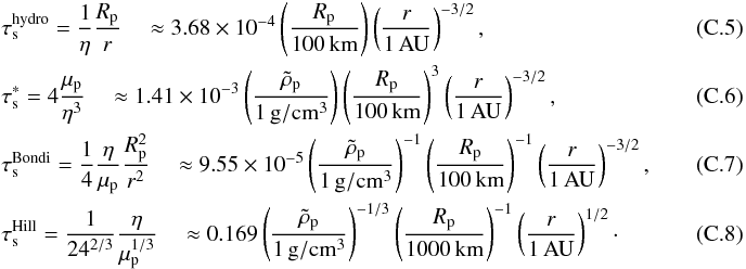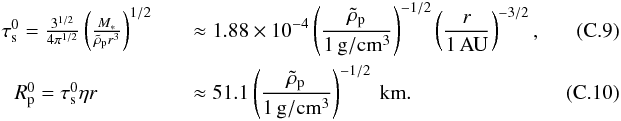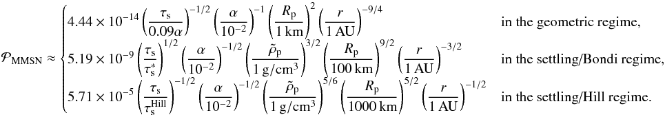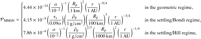 Using Eqs. (C.2), (31), (35), (80), (81), and (88), the collision probabilities for the three regimes defined in Eq. (C.3)can be written (C.11)When using the approximation from Eq. (C.1)and the MMSN scalings from Appendix A, this yields for small particles such that τs< 0.09α: