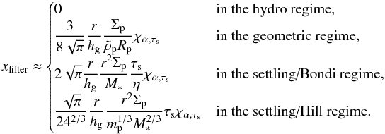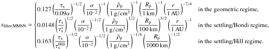 The filtering efficiency as defined by Eq. (58)writes for the regimes considered: (C.14)The MMSN scaling then yields, for small particles such that τs< 0.09α: