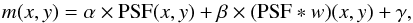 In presence of clustering, the outcome of a stacking is not only a PSF with the mean flux of the population and a constant background (corresponding to the surface brightness of all galaxy populations i.e., the cosmic infrared background). There is in addition a signal coming from the greater probability of finding another neighboring infrared galaxy compared to the field because of galaxy clustering. The signal in the stacked image can thus be modeled by Bavouzet (2008) and Béthermin et al. (2010b)(A.1)where m is the stacked image, PSF the point spread function, and w the auto-correlation function. The symbol ∗ represents the convolution. α, β, and γ are free parameters corresponding to the intensity of the mean flux of the population, the clustering signal, and the background, respectively. This method works only if the PSF is well-known, the extension of the sources is negligible compared to the PSF, and the effects of the filtering are small at the scale of the stacked image. Consequently, we applied this method only to the SPIRE data for which these hypotheses are the most solid. The uncertainties on the clustering bias (β/α for the photometry we chose to use for SPIRE data) are estimated fitting the model described previously on a set of stacked images produced from 1000 bootstrap samples. The results are shown in Fig. A.1 (red diamonds).