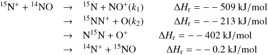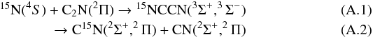These reactions have been studied experimentally by Adams & Smith (1981) at 80 K without differentiating between N15NH+ and 15NNH+. The total rate is 4.6 × 10-10 cm3 s-1. We thus take half this value for the forward reaction rate constant, considering the symmetry factor, and we assume no barrier for these rapid reactions. We also introduce the