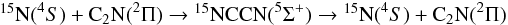 ) adduct is found at an energy of –183 kJ/mol below that of the N(4S) + C2N (2Π) level (at the MRCI+Q, RCCSD(T) and DFT level of calculations). However, no exothermic bimolecular exit channel is available on this quintuplet surface. We thus conclude that the quintuplet surface could lead to isotopic exchange and finally consider the two following possibilities for this reaction involving the very reactive C2N radical (Wang et al. 2005, 2006), i.e. the triplet channel,