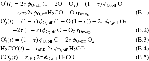 Likewise, the terms involving the ER and LH mechanisms are independent of one another, thus we are able to determine the amount of a species formed (or consumed) via the ER or the LH mechanism. For the sake of simplicity, the differential equations were divided into two sets, accounting for the two formation mechanism separately. Below is the list of equations governing the CO2 formation by the ER mechanism: O, O2, O3, H2CO, and CO2 are the surface densities (expressed in fractions of ML) of the species, τ is the dissociated fraction of O2 defined in Sect. 2, φO2off is the flux (0.003 cm-2 s-1) of O2, ϵ is the evaporation probability – due to chemical desorption − of O2 formed on the surface (Dulieu et al. 2013), and