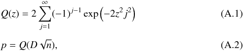Finally, we sort the grid cells of ⟨ Σsolid ⟩ t in order from highest to lowest density, and compute the cumulative distribution F of the sorted grid cells. If the particle distribution is uniform, then F forms a straight diagonal line G from (0, 0) to (1, 1). We use the difference F−G as a large-scale measure of clumping. The Kolmogorov-Smirnov (Smirnov 1948; Wall & Jenkins 2003) test gives a standard way to compare F and G. It computes a p-value that measures probability that the data set that produced F follows the distribution Gwhere D is the maximum distance between F and G, and n is the number of independent observations. We caution the reader against interpreting these p-values as strict probabilities; we only use p as a convenient metric to measure clumping. With that in mind, we divide the p-values into four broad categories: