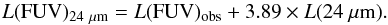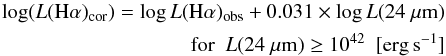 (C.3)where the observed (L(Hα)obs)12 and corrected (L(Hα)cor) Hα luminosities and the 24 μm luminosity (L(24 μm)) are expressed in erg s-1.